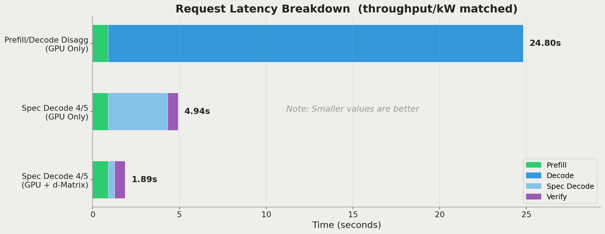 Request latency breakdown for 3 configurations, given a fixed throughput/kW. User-facing request latency goes from 25s to more than 5X faster by adopting the homogeneous speculative decoding setup. Then, another 2.6X benefit on top of that is delivered by incorporating the Corsair to run the speculative decoder. Note that network latency between phases is tacked on to per-phase latency, not excluded.